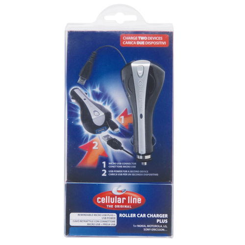 Caricatore cellulare da auto con cavo retrattile e presa usb supplementare cellularline