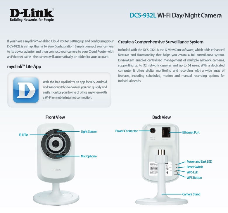 Il dispositivo DCS-932L è compatibile con lo standard wireless 802.11n per un’integrazione facile e veloce nell’ambiente di rete esistente, per lo streaming video di alta qualità, la trasmissione dei dati rapida e sicura, anche in postazioni lontane dal router e difficilmente raggiungibili dal cavo.